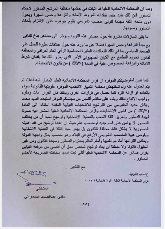ودعا السامرائي في شكواه المفوضية إلى اتخاذ الإجراءات القانونية اللازمة بحق الحلبوسي، وتطبيق مواد قانون الانتخابات التي تمنع ترشح من تثبت عليه مثل هذه المخالفات.