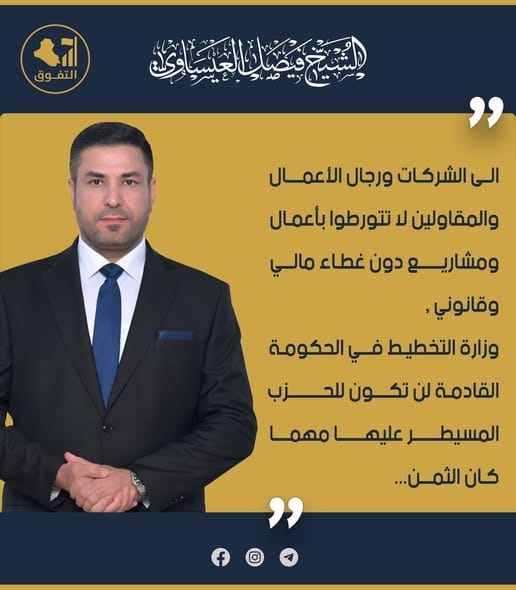 فقد وجه النائب السابق فيصل العيساوي رسالة شديدة اللهجة إلى الشركات والمقاولين، دعاهم فيها إلى عدم التورط في مشاريع دون غطاء مالي أو قانوني، مؤكداً أن وزارة التخطيط في الحكومة القادمة لن تكون للحزب المسيطر عليها حالياً مهما كان الثمن. واعتُبر تصريح العيساوي بمثابة رد مباشر على تصريحات الحلبوسي التي أثارت جدلاً واسعاً داخل الأوساط السياسية والاقتصادية.