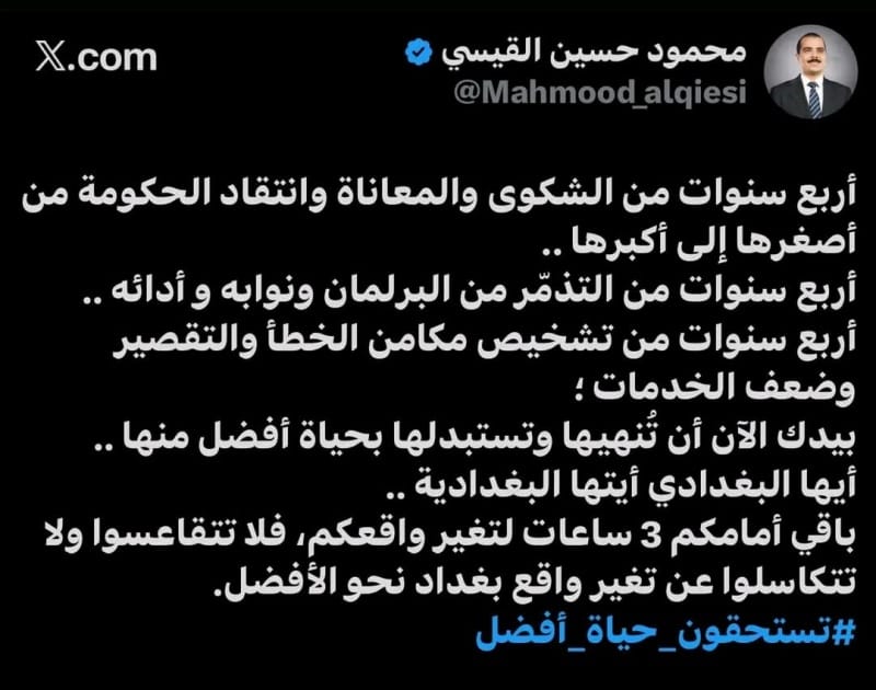 وقال القيسي في منشور على منصة “أكس” تابعته ” بغداد أوبزرفر”، إن “أربع سنوات من الشكوى والمعاناة وانتقاد الحكومة من أصغرها إلى أكبرها، وأربع سنوات من التذمر من البرلمان ونوابه وأدائه، وأربع سنوات من تشخيص مكامن الخطأ والتقصير وضعف الخدمات”، مضيفاً: “بيدك الآن أن تنهيها وتستبدلها بحياة أفضل منها”.