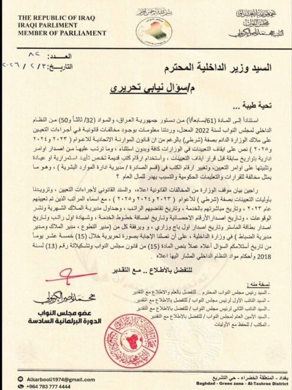 وجّه النائب محمد ناصر الكربولي، اليوم الثلاثاء ( 3 شباط 2026 )، سؤالاً نيابياً تحريرياً إلى وزير الداخلية، بشأن مخالفات قانونية مزعومة في إجراءات التعيين على ملاك الوزارة الدائم بصفة (شرطي) للأعوام 2023 و2024 و2025.