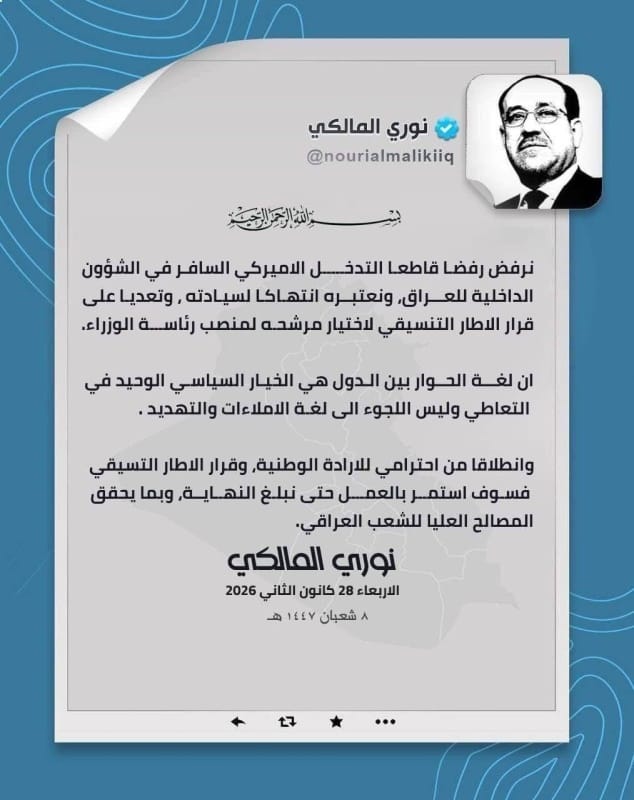 المالكي: نرفض التدخل الأمريكي السافر في الشأن الداخلي العراقي