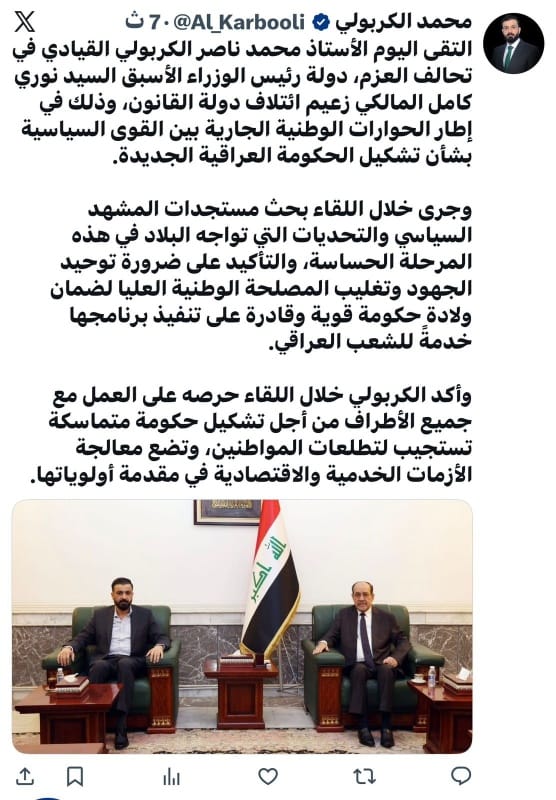 وكتب المكتب الاعلامي للكربولي في تدوينة على مواقع التواصل الاجتماعي وتابعتها ” بغداد أوبزرفر”، إن الاخير “التقى زعيم ائتلاف دولة القانون نوري المالكي وذلك في إطار الحوارات الوطنية الجارية بين القوى السياسية بشأن تشكيل الحكومة العراقية الجديدة”.
