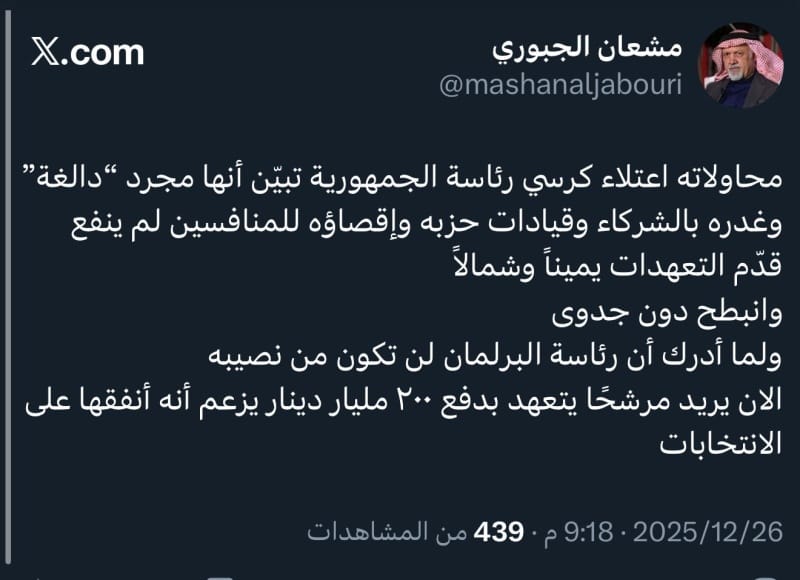 هذا التصعيد بالتزامن مع استمرار اجتماعات “المجلس السياسي الوطني” الذي يضم القوى السنية، وسط حديث عن اجتماع حاسم قبل 24 ساعة من الجلسة الاولى لمجلس النواب المقررة يوم الأثنين (29 كانون الأول 2025)، بهدف الخروج بمرشح واحد لرئاسة المجلس بدل الذهاب الى منافسة مفتوحة داخل القبة، في ظل تداول اسمين بارزين للتنافس على المنصب أبرزهم رئيس تحالف العزم مثنى السامرائي.