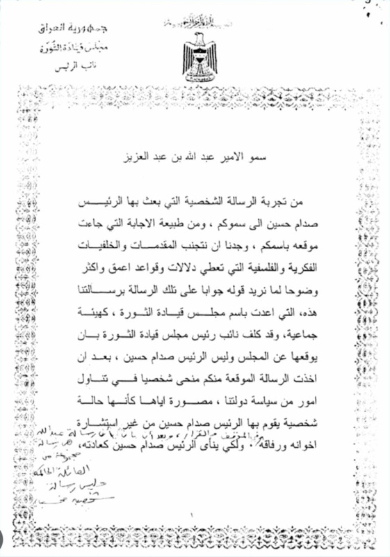 كشفت رسائل متداولة منسوبة إلى رئيس النظام السابق صدام حسين، تعود إلى عام 2001، عن توجيهه عتابا شديد اللهجة إلى ولي العهد السعودي آنذاك عبد الله بن عبد العزيز، محمّلا الرياض جزءا من مسؤولية اندلاع الحرب العراقية الإيرانية عام 1980.