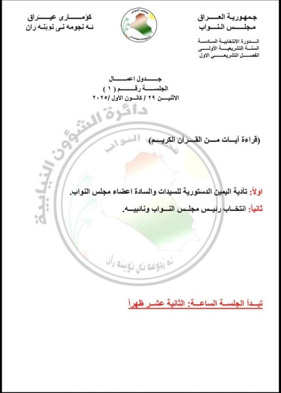 بغداد أوبزرفر -جدول أعمال مجلس النواب يوم 29 كانون الأول الحالي لانتخاب رئيسه ونائبيه