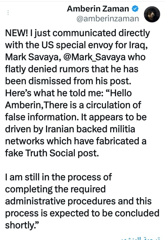 وأضافت أنّ سافايا أوضح لها أنّه ما زال بصدد استكمال الإجراءات الإدارية الخاصة بمهمته، وأنّ هذه العملية يتوقّع أن تنتهي قريبًا، بما يعني استمرار تكليفه رسميًا بملف العراق من جانب الإدارة الأمريكية، على الرغم من الجدل الذي أثارته الشائعات الأخيرة.