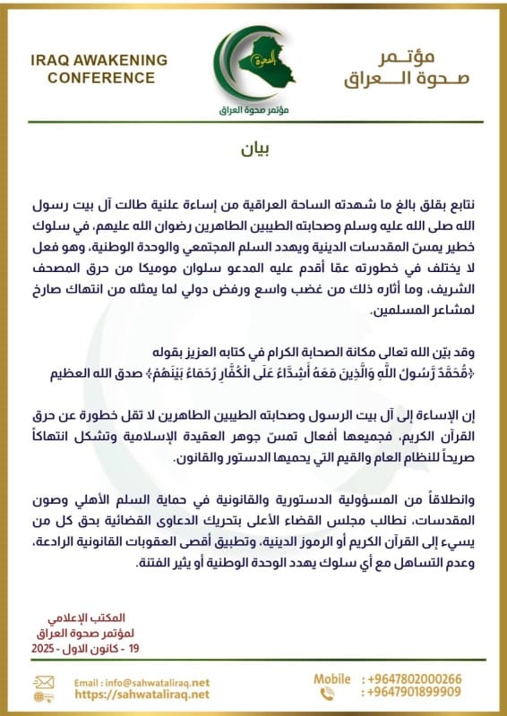 وقال المؤتمر في بيان تلقته ” بغداد أوبزرفر”، إنّ الإساءة إلى آل بيت الرسول وصحابته الطاهرين لا تقلّ خطورة عن جريمة حرق المصحف الشريف التي أقدم عليها المدعو سلوان موميكا، وما أثارته من غضب واسع ورفض دولي لما مثّلته من انتهاك صارخ لمشاعر المسلمين.