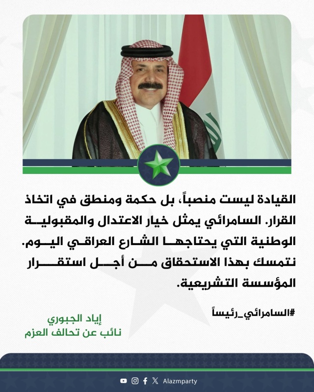 وقال النائب عن تحالف العزم إياد الجبوري في تدوينة تابعتها ” بغداد أوبزرفر”، إن “القيادة ليست منصباً، بل حكمة ومنطق في اتخاذ القرار، والسامرائي يمثل خيار الاعتدال والمقبولية الوطنية التي يحتاجها الشارع العراقي اليوم”.