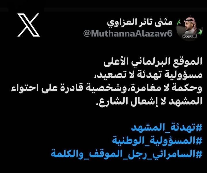 من جانبه، شدد السياسي مثنى ثائر العزاوي على ضرورة اختيار شخصية قادرة على احتواء المشهد السياسي، مؤكداً أن “الموقع البرلماني الأعلى مسؤولية تهدئة لا تصعيد، وحكمة لا مغامرة”.