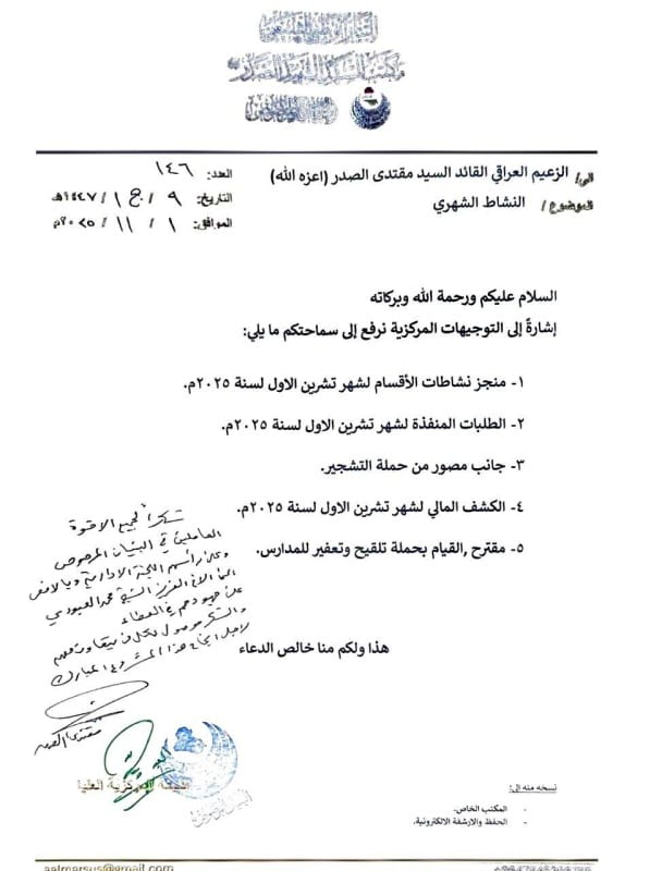 كما اطلع الصدر على نشاط شهر تشرين الأول 2025 والذي قدم من قبل مشروع البنيان المرصوص، موجهاً شكره إلى إدارة المشروع والعاملين فيه قائلاً: “شكراً لجميع الإخوة العاملين في البنيان المرصوص وعلى رأسهم اللجنة الإدارية وبالأخص الشيخ محمد العبودي على جهودهم فـي العطاء والشكر موصول لكل من يتعاون معهم لأجل إنجاح هذا المشروع المبارك”.