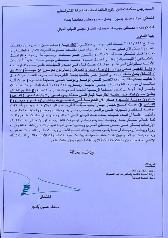 تداولت مواقع التواصل الاجتماعي، اليوم السبت (18 تشرين الأول 2025)، وثيقةً رسمية صادرة عن عضو مجلس محافظة بغداد المغتال صفاء حسين ياسين المشهداني، تُظهر تقديمه شكوى أمام محكمة تحقيق الكرخ الثالثة المختصة بقضايا النشر، ضد النائب مصطفى جبار سند، على خلفية تصريحات نُسبت للأخير بعد تفجير الطارمية في كانون الثاني الماضي.