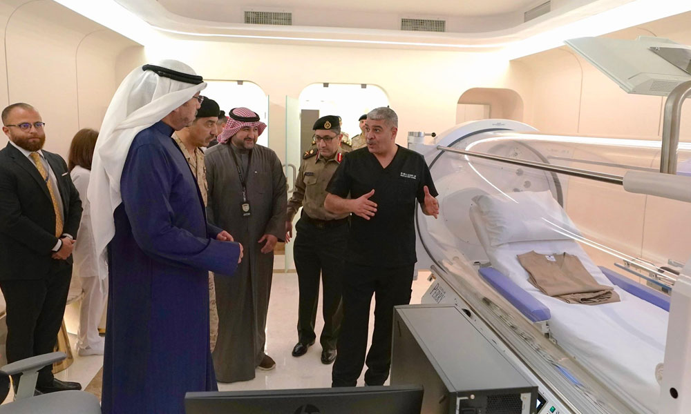 كما قام بجولة ميدانية على عدد من الأقسام الطبية منها وحدة العناية المركزة بسعة سريرية تصل إلى 14 وحدة وتحتوي على أحدث الأجهزة المطورة ومركز (شريفة الحمد المبارك الصباح) للعلاج بالأوكسجين المضغوط اطلع خلالها على سير العمل وآلية تقديم الخدمات الطبية والوقائية بالمركز الذي يعد الأول في دولة الكويت.