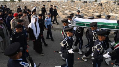 وزير الداخلية الشيخ فهد اليوسف يتقدم جموع مشيعي شهيدي الواجب بدر العازمي وطلال الدوسري في المقبرة حيث واراهما الثرى